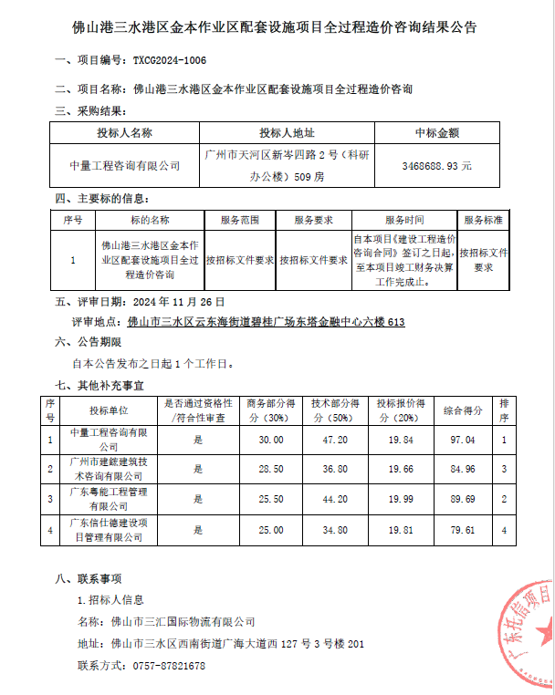 佛山港三水港区金本作业区配套设施项目全过程造价咨询结果公告