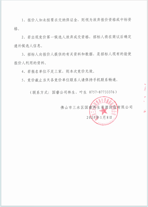 佛山市三水区国睿再生资源回收有限公司湿料和湿泥混合物竞价公告(第二次)