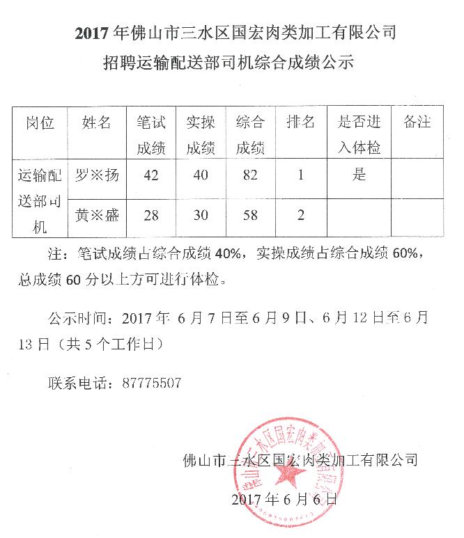 2017年佛山市三水区国宏肉类加工有限公司招聘运输配送部司机综合成绩公示