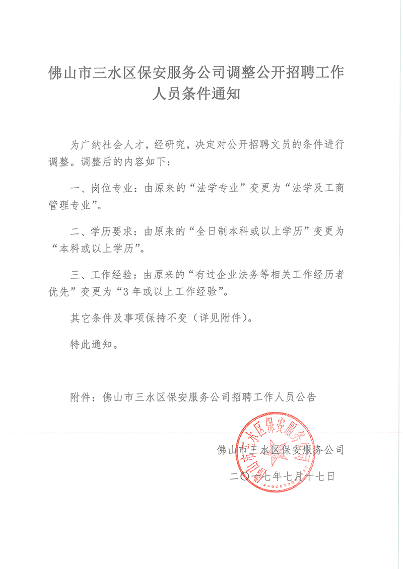 佛山市三水区保安服务有限公司调整公开招聘工作人员条件通知