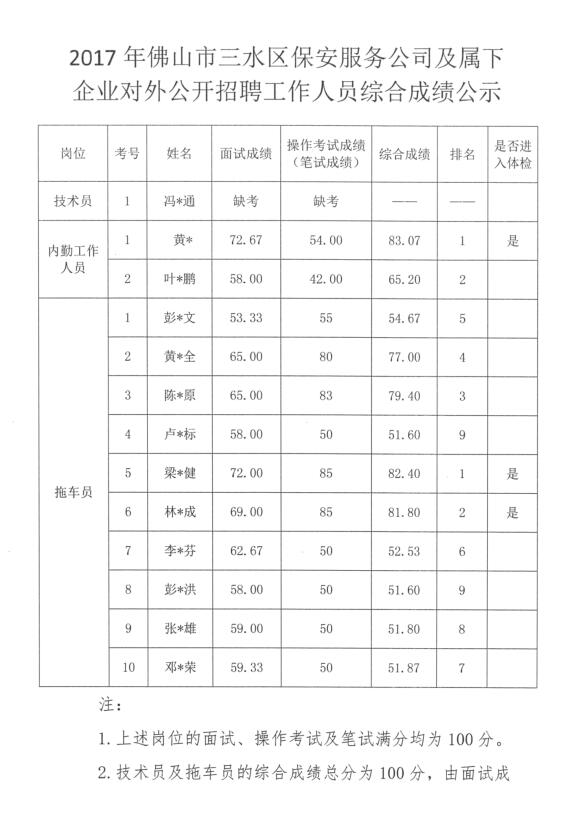 2017年佛山市三水区保安服务公司及属下企业对外公开招聘工作人员综合成绩公示