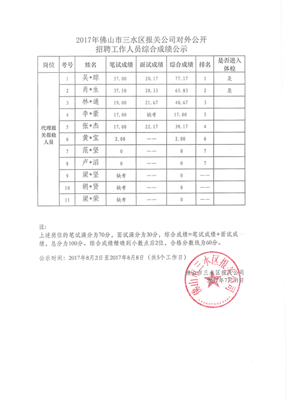 2017年佛山市三水区报关公司对外公开招聘工作人员综合成绩公示