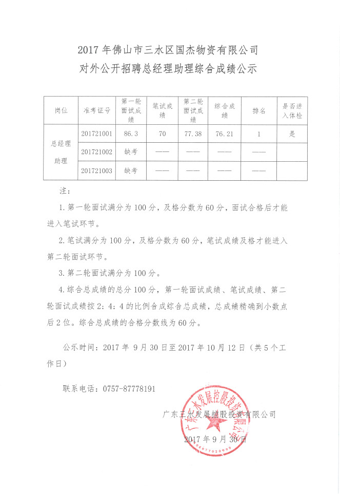 2017年佛山市三水区国杰物资有限公司对外公开招聘总经理助理综合成绩公示