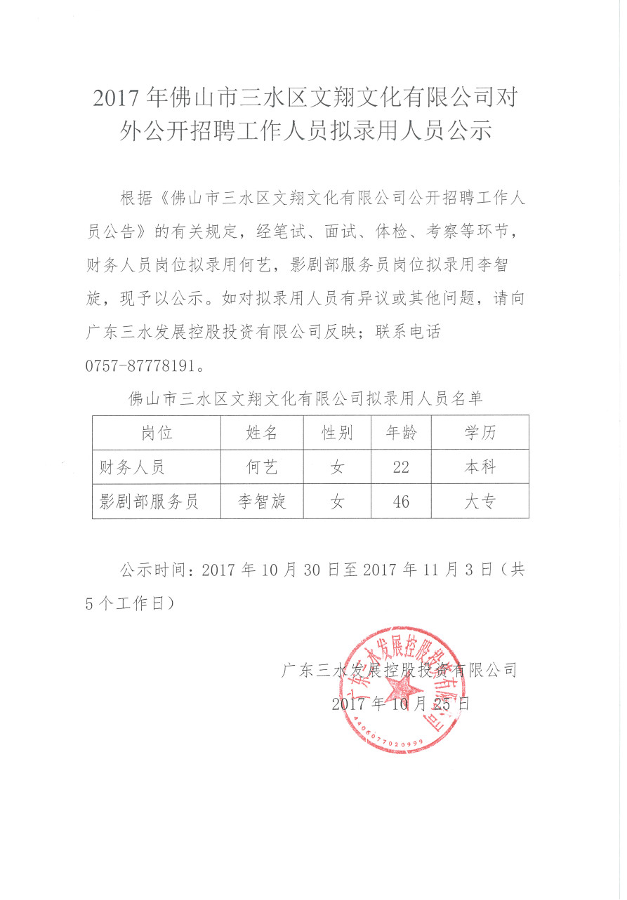 2017年佛山市三水区文翔文化有限公司对外公开招聘工作人员拟录用人员公示