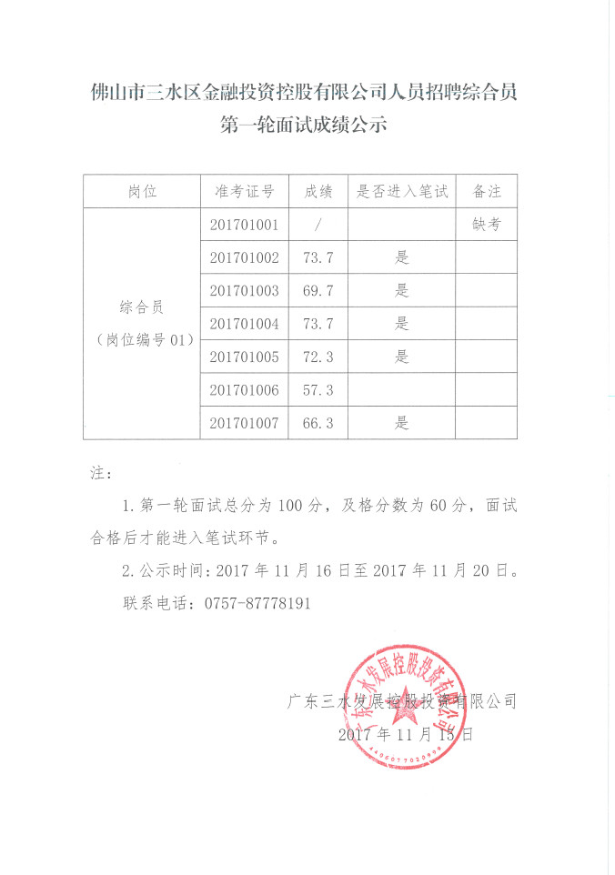 佛山市三水区金融投资控股有限公司人员招聘综合员第一轮面试成绩公示