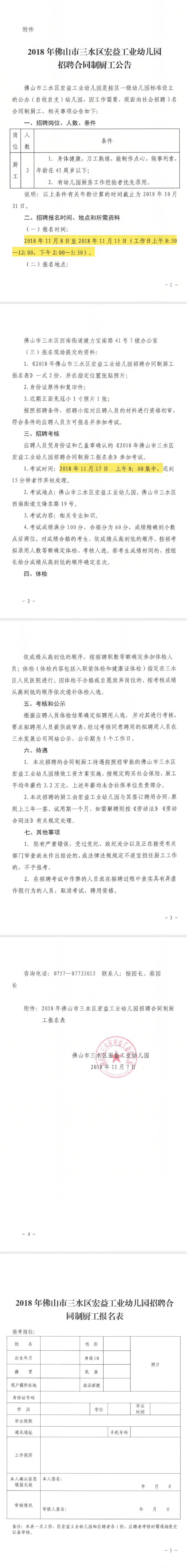 附件:2018年佛山市三水区宏益工业幼儿园招聘合同制厨工报名表