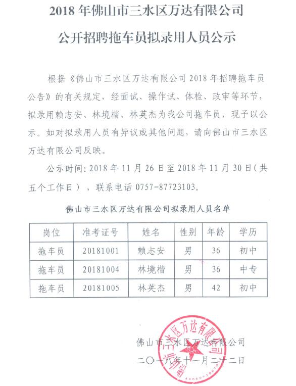 2018年佛山市三水区万达有限公司公开招聘拖车员拟录用人员公示
