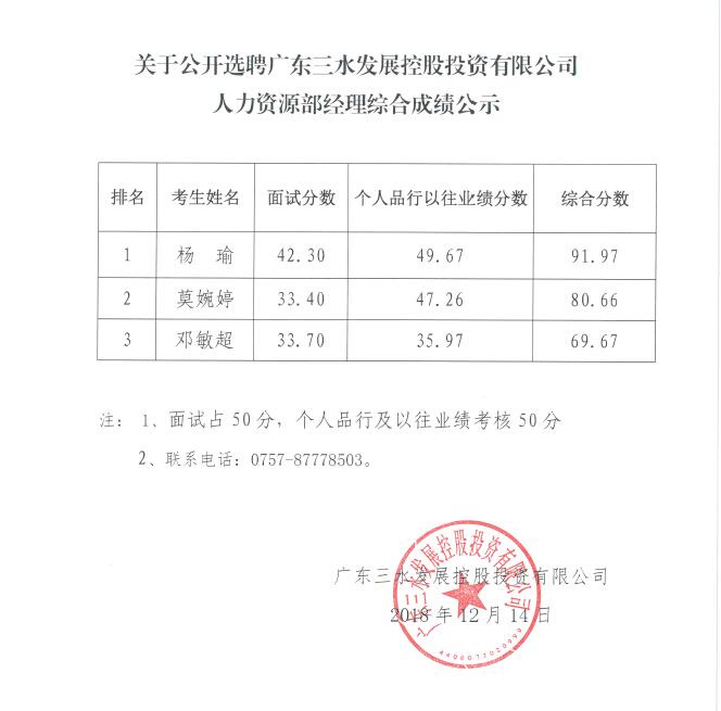 关于公开选聘1946伟德官方网站人力资源部经理综合成绩公示