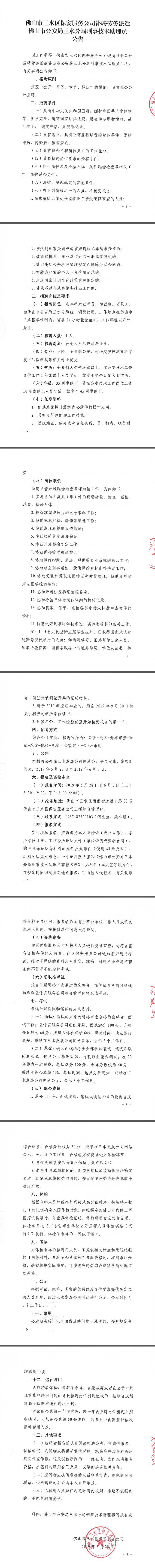 佛山市三水区保安服务公司补聘劳务派遣佛山市公安局三水分局刑事技术助理员公告
