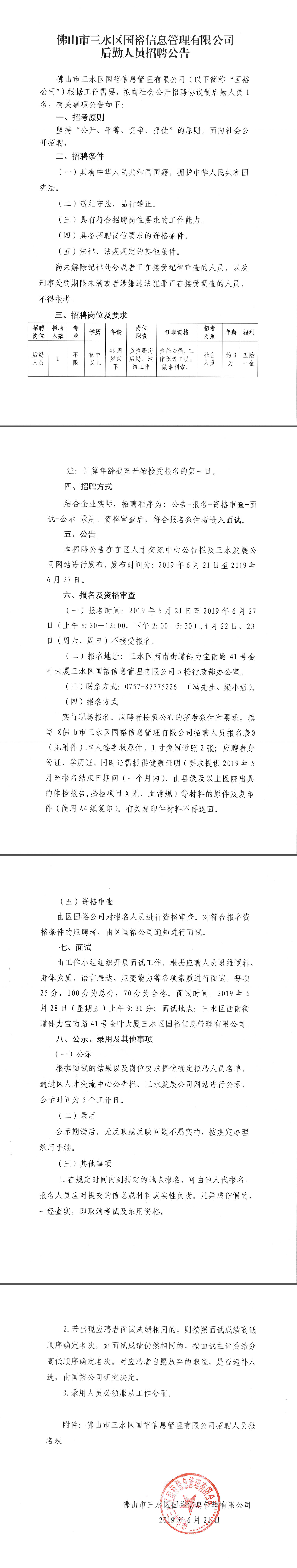 佛山市三水区国裕信息管理有限公司后勤人员招聘公告