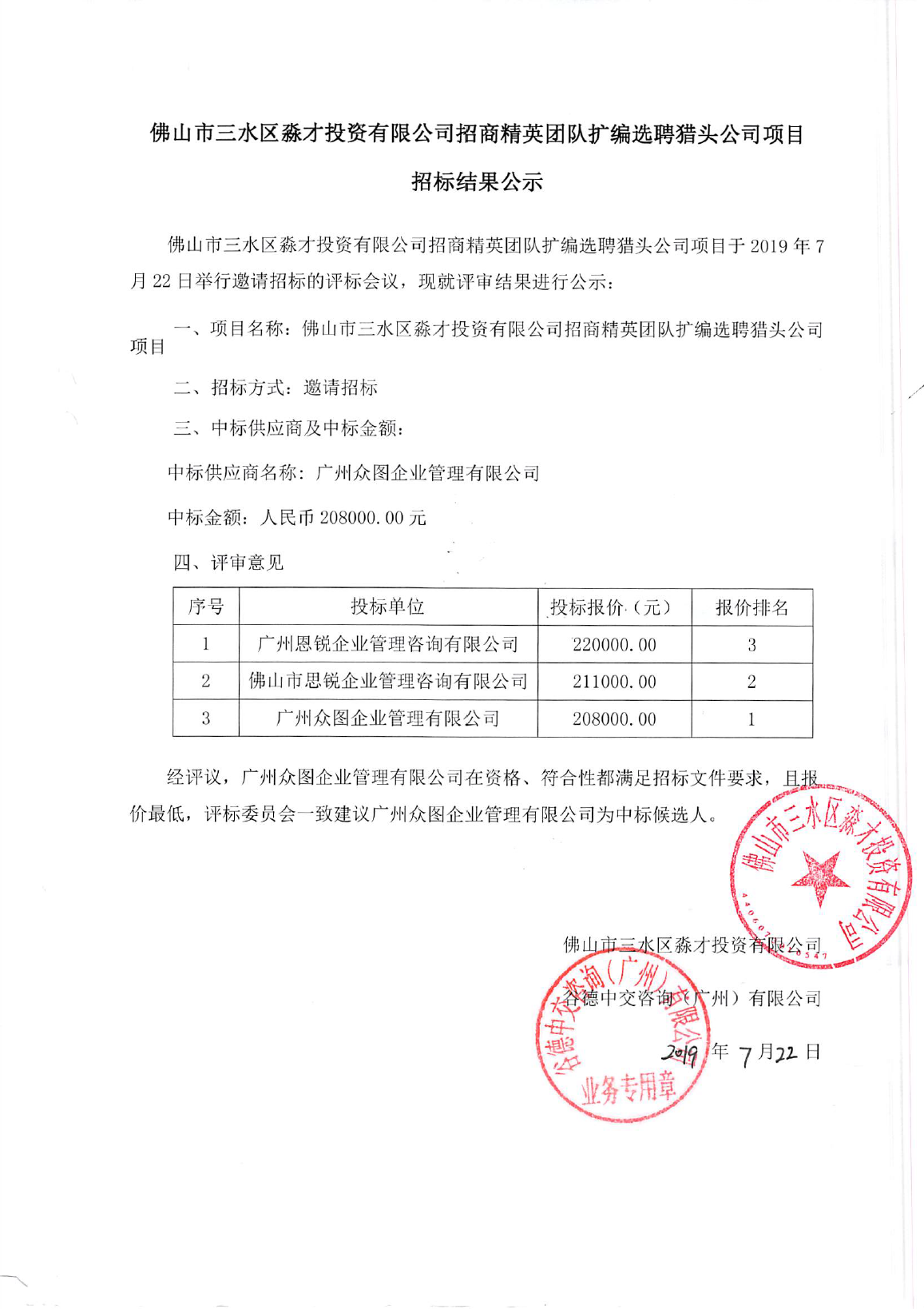 佛山三水区淼才投资有限公司招商精英团队扩编选聘猎头公司项目招标结果公示