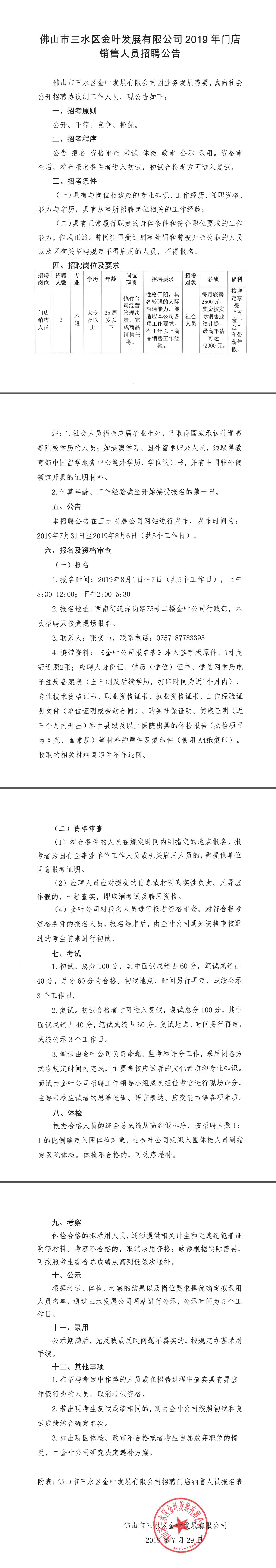 佛山市三水区金叶发展有限公司2019年门店销售人员招聘公告