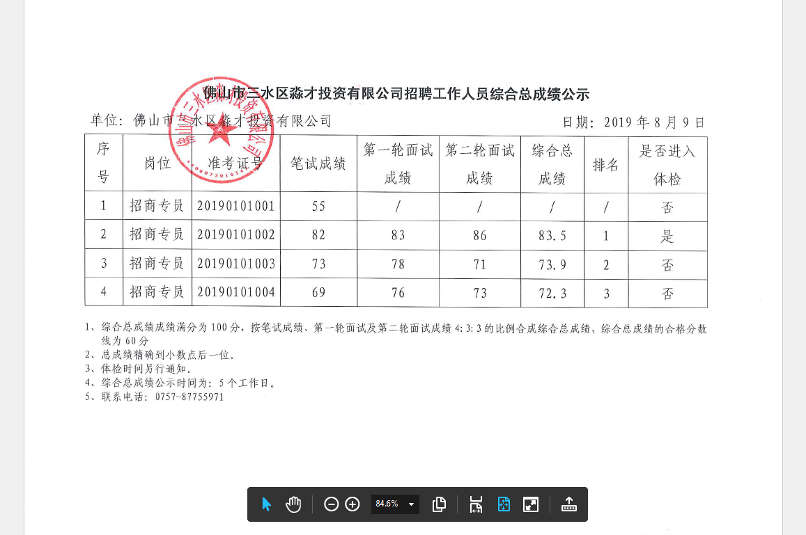 佛山市三水区淼才投资有限公司招聘工作人员综合总成绩公示(招商专员)