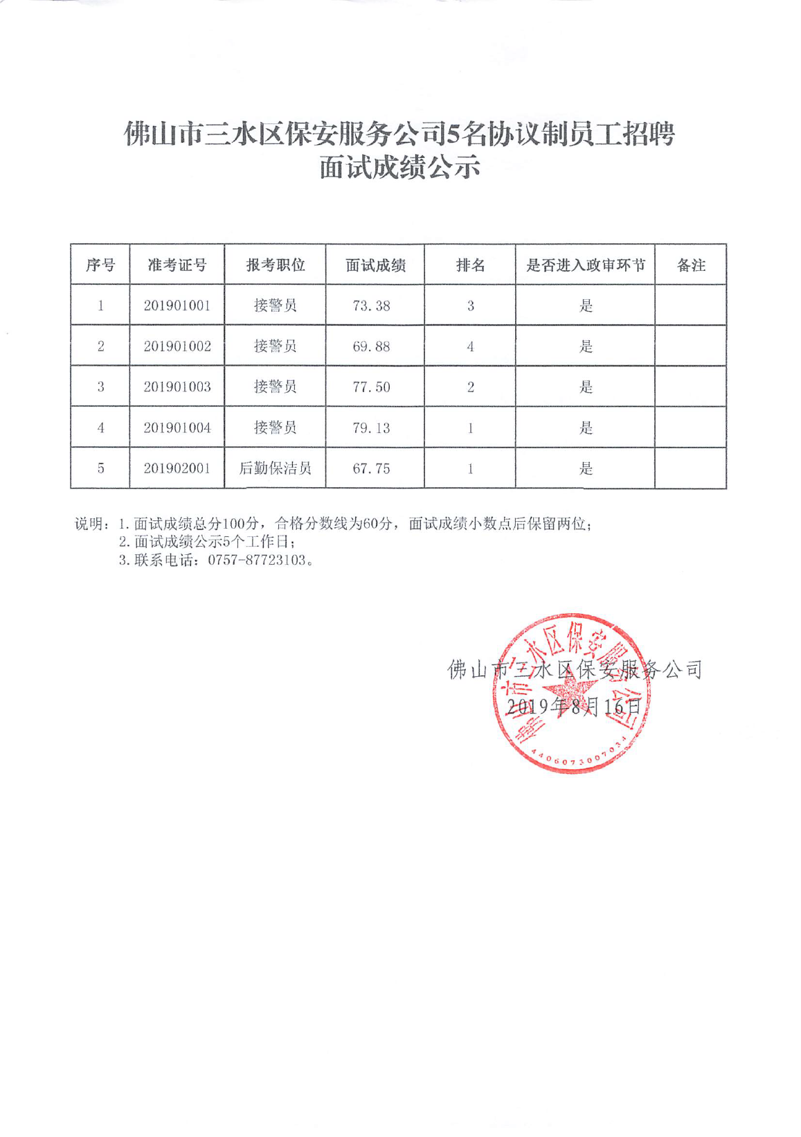 佛山市三水区保安服务公司5名协议制员工招聘面试成绩公示