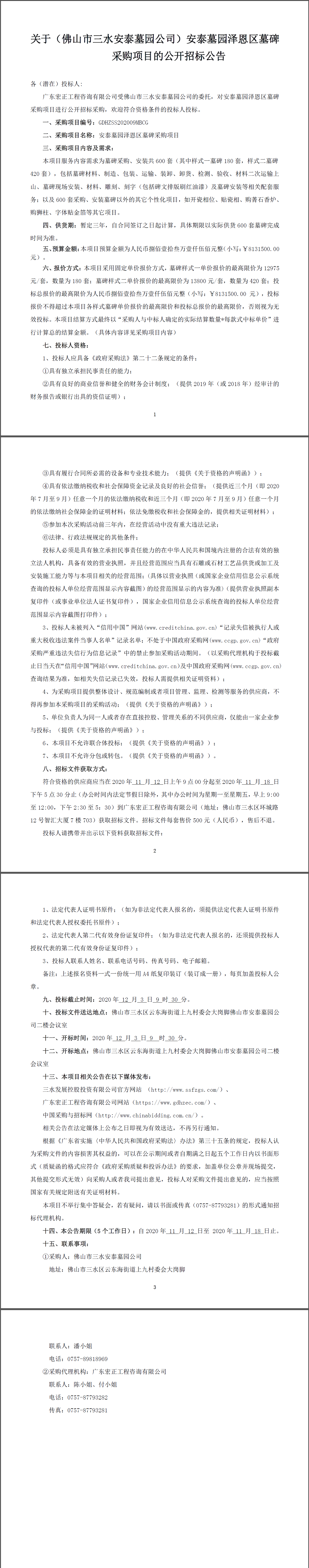 关于(佛山市三水安泰墓园公司)安泰墓园泽恩区墓碑采购项目的公开招标公告