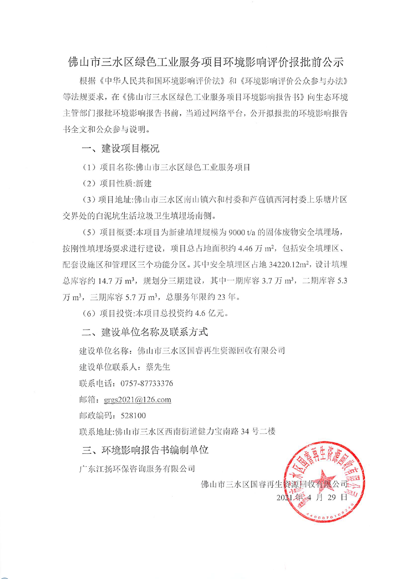 佛山市三水区绿色工业服务项目环境影响评价报批前公示