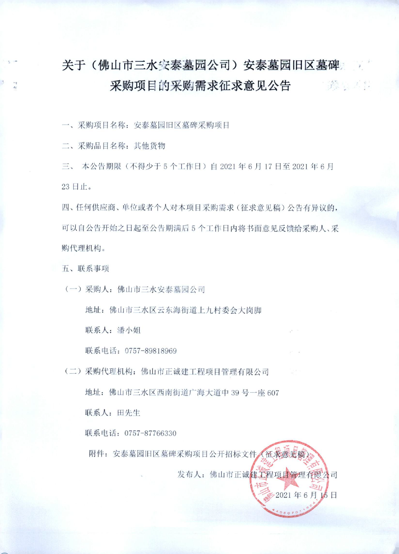 关于(佛山市三水安泰墓园公司)安泰墓园旧区墓碑采购项目的采购需求征求意见公告