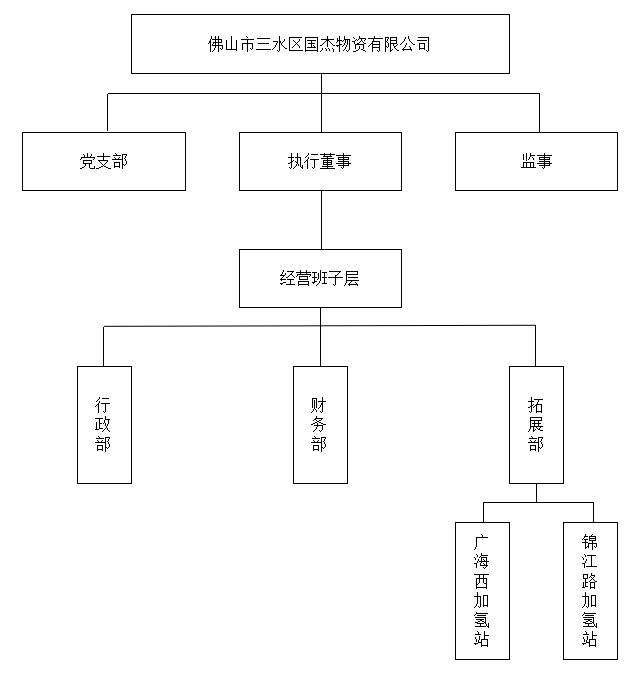 佛山市三水区国杰物资有限公司内设三个职能部门:行政部、财务部、拓展部。拓展部属下管理2个加氢站,以及4个加油站:宝南加油站、广海加油站,河口加油站,顺锋加油站。