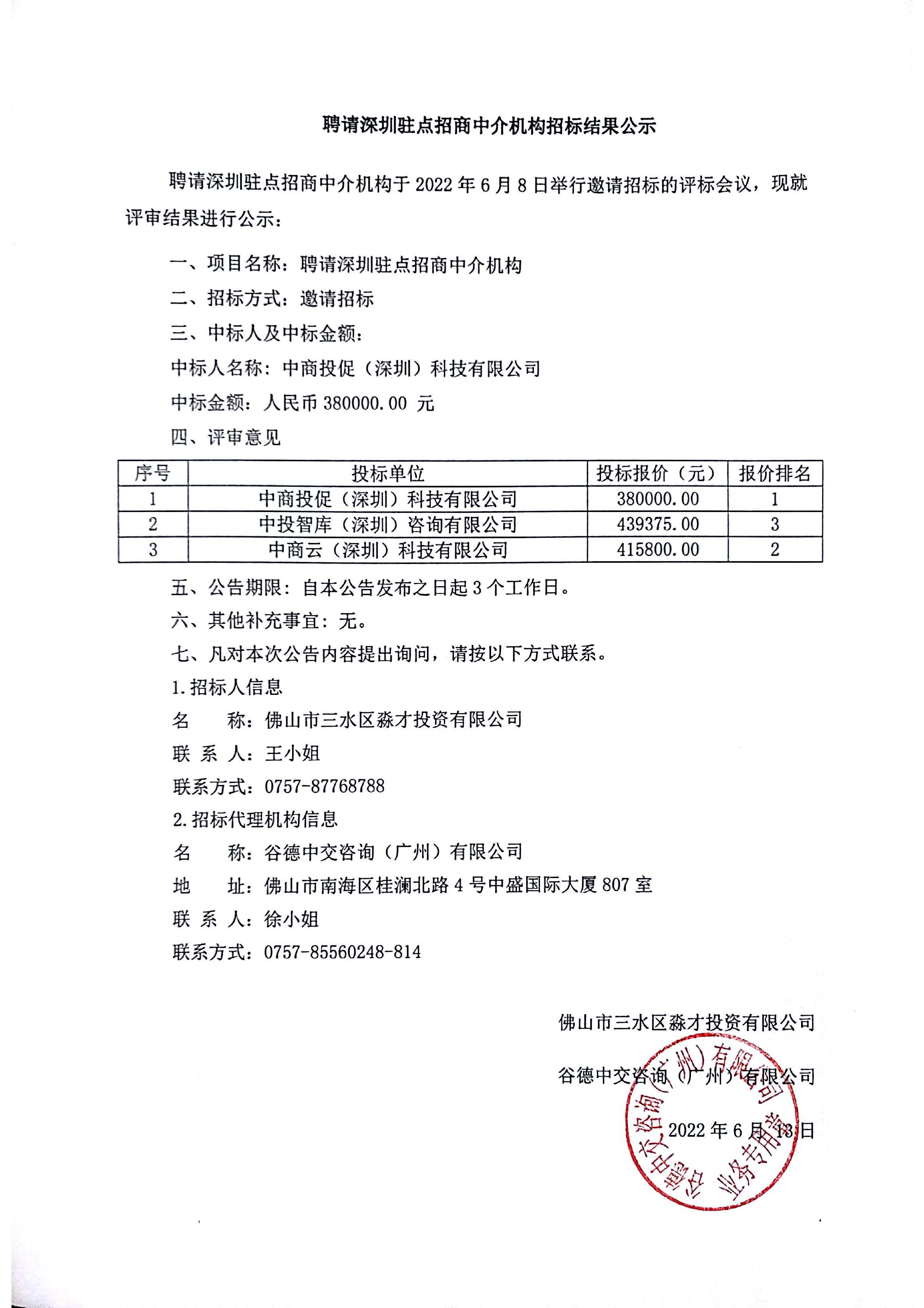 聘请深圳驻点招商中介机构招标结果公示