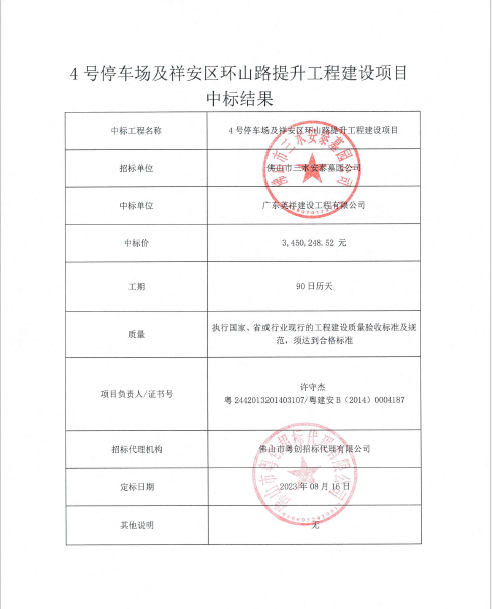 安泰公司4号停车场及祥安区环山路提升工程建设项目中标结果公示