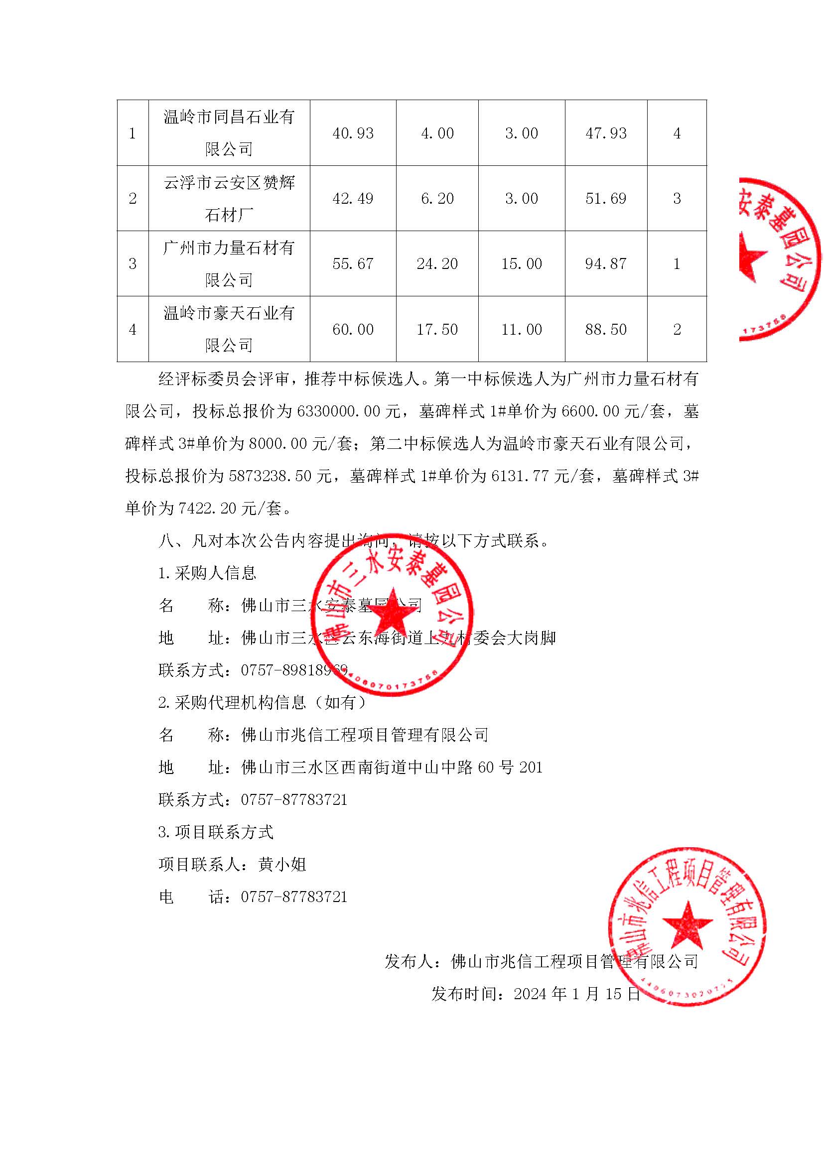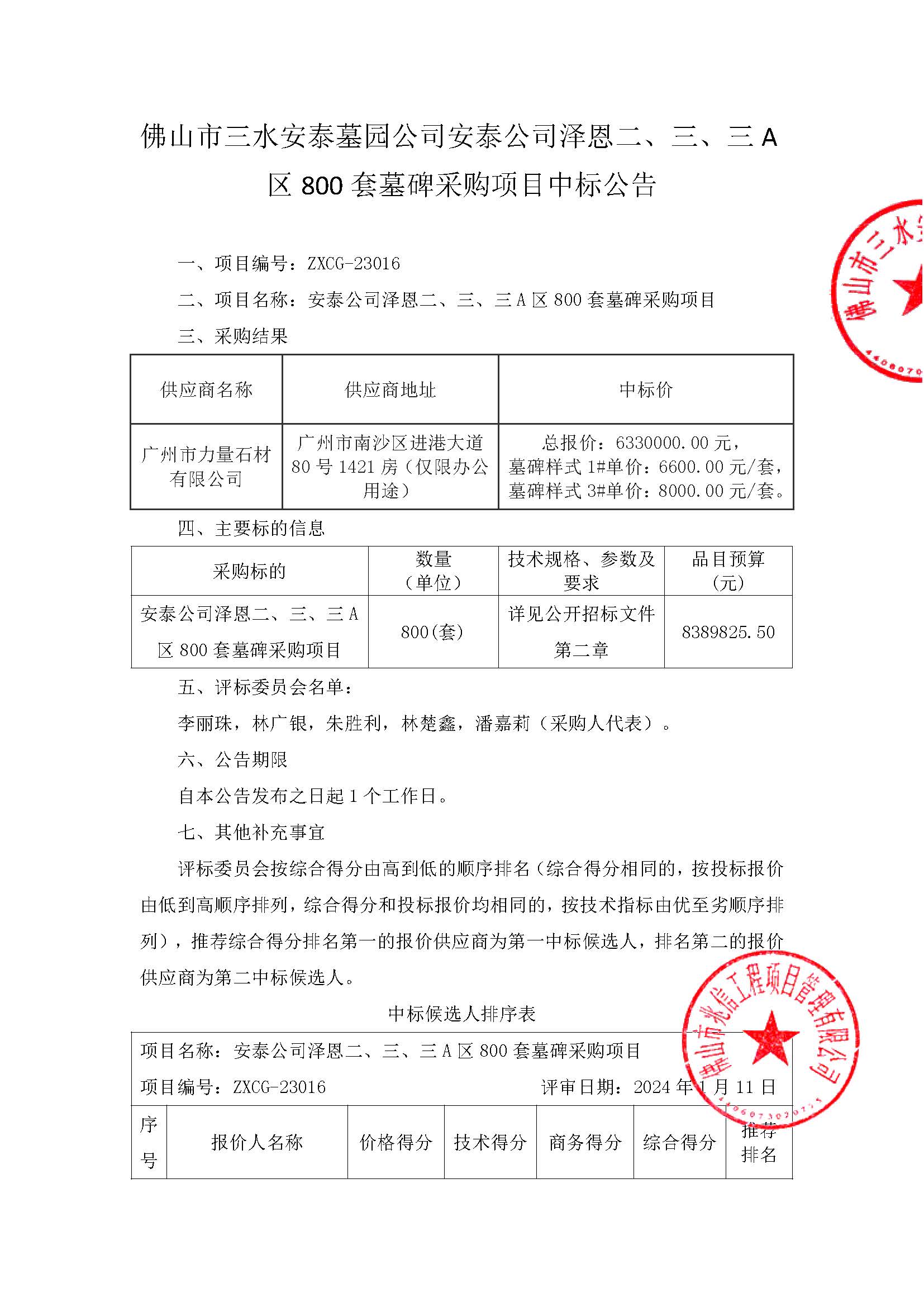 “安泰公司泽恩二、三、三A区800套墓碑采购项目”中标公告