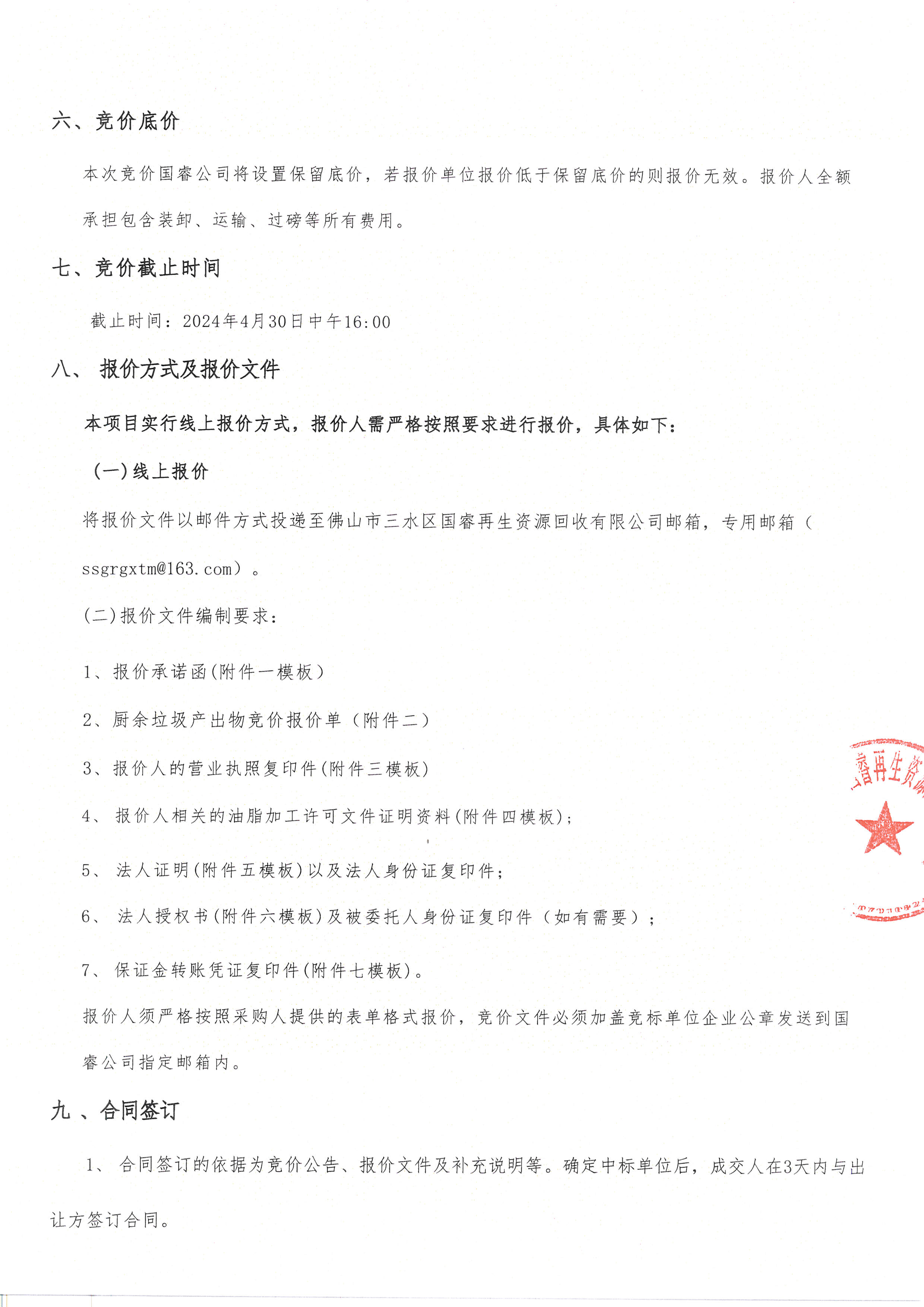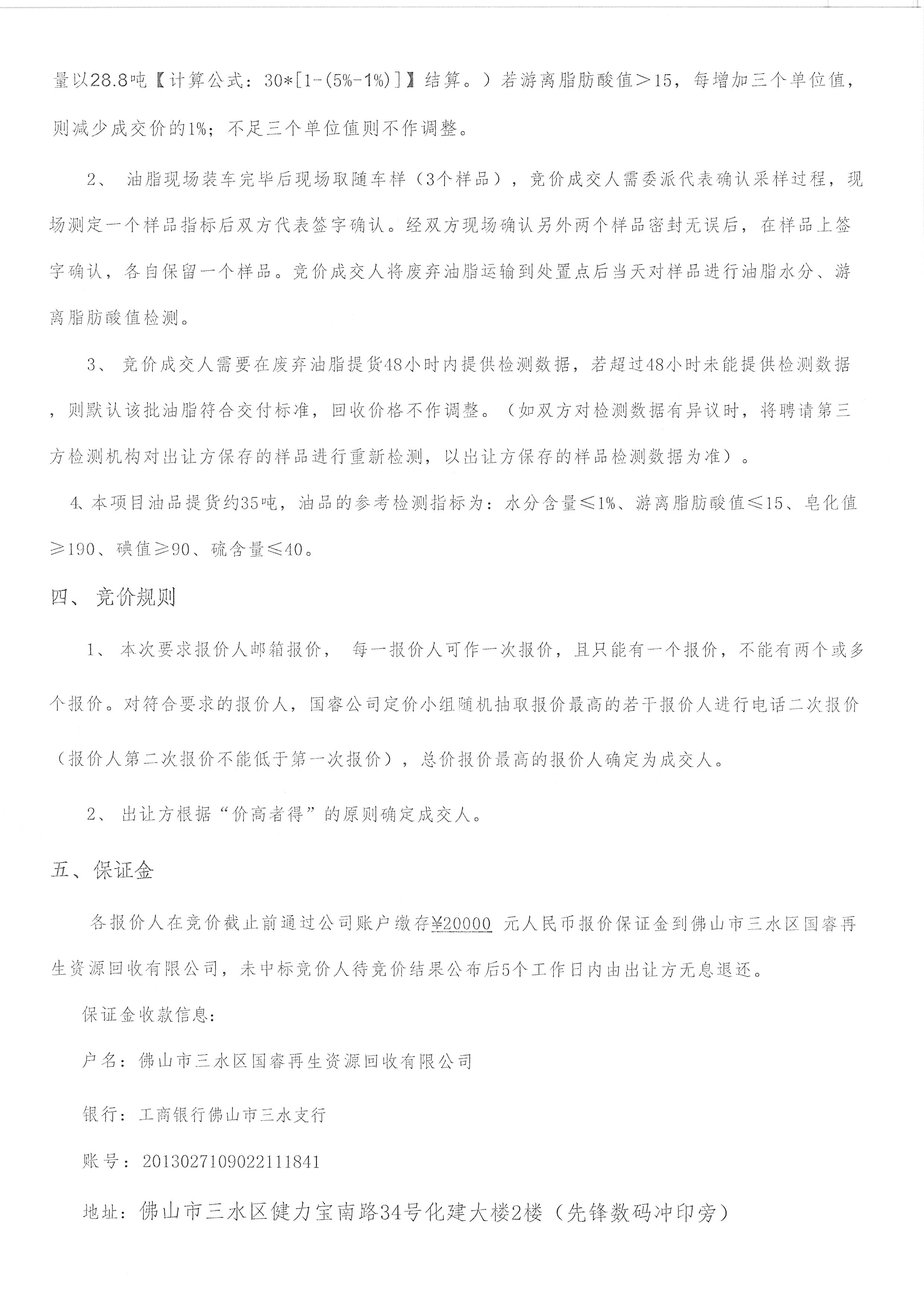 佛山市三水区国睿再生资源回收有限公司厨余废弃油脂竞价公告