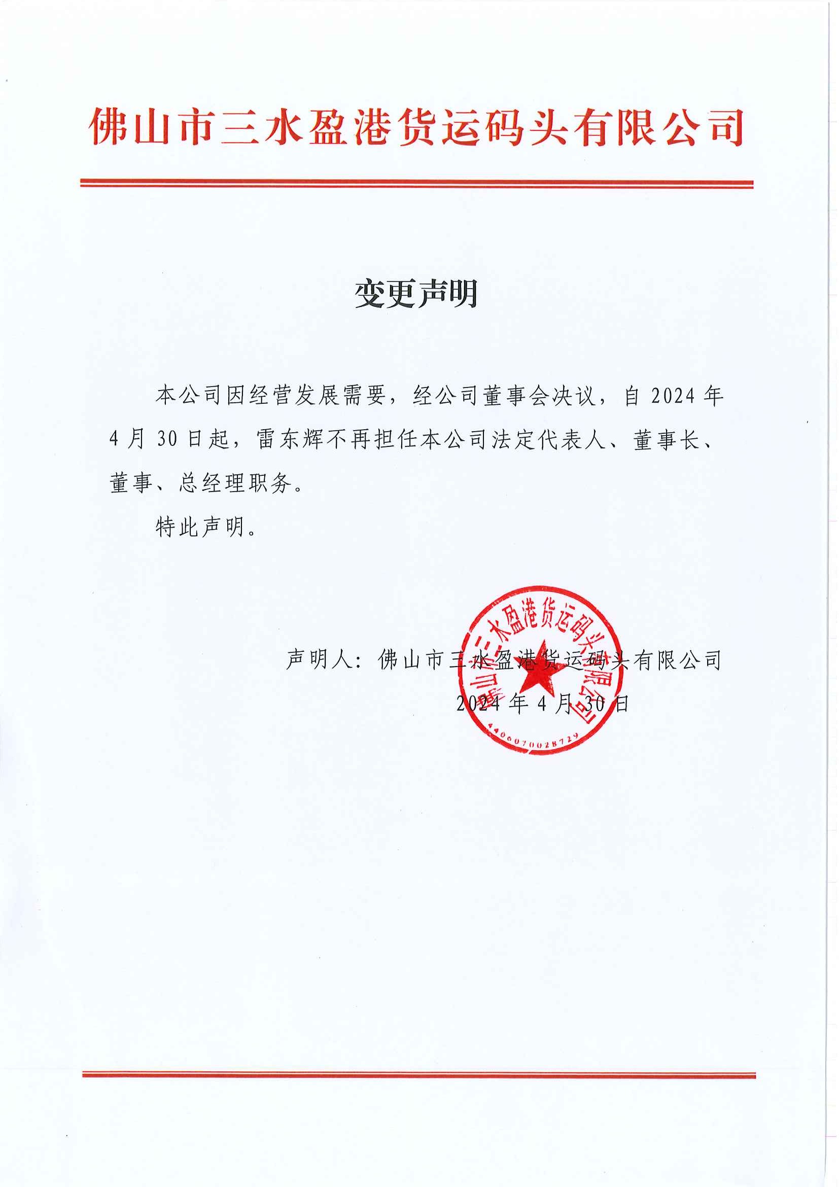 变更声明(通知不特定相对人)盈港法人