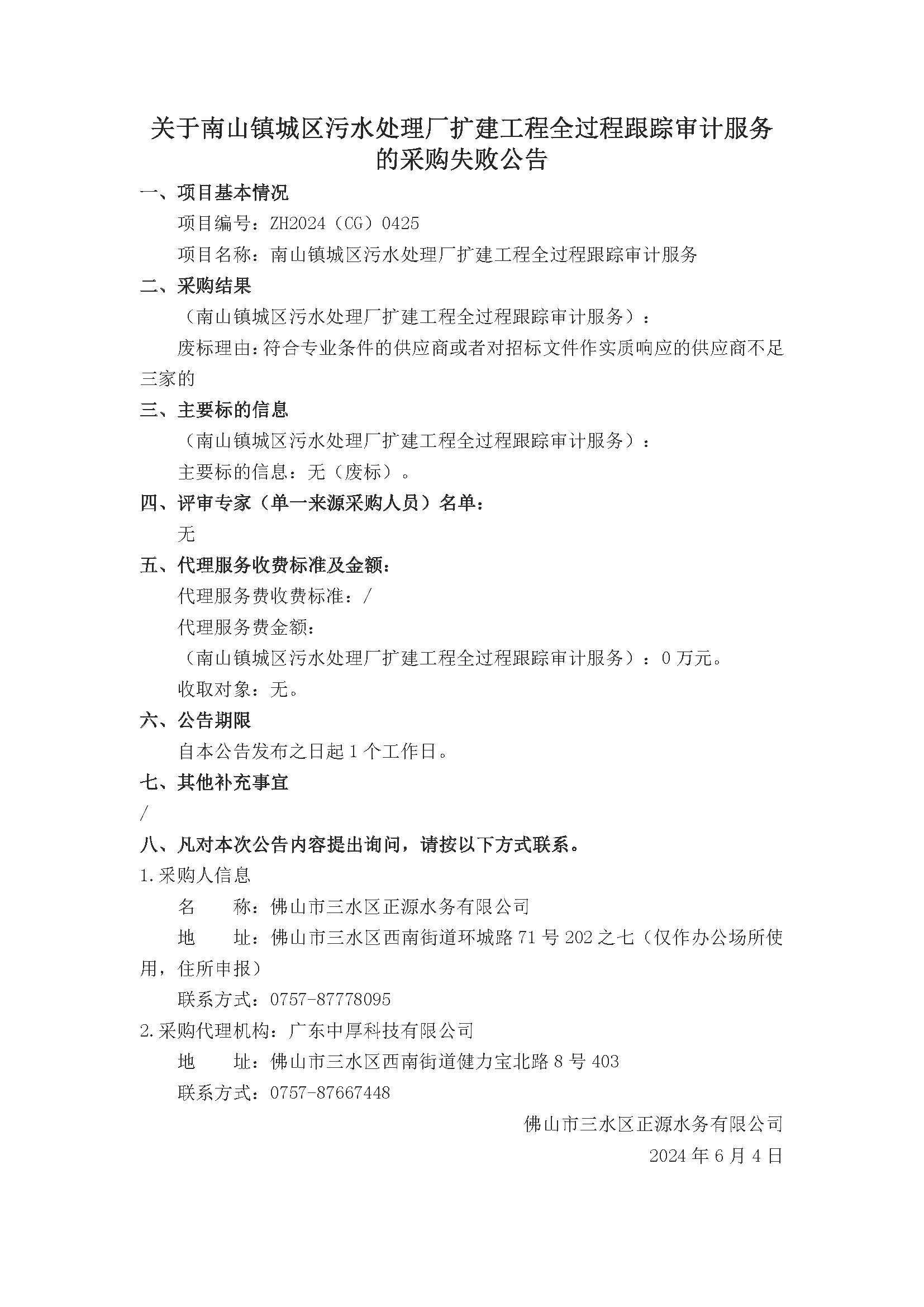 关于南山镇城区污水处理厂扩建工程全过程跟踪审计服务的采购失败公告