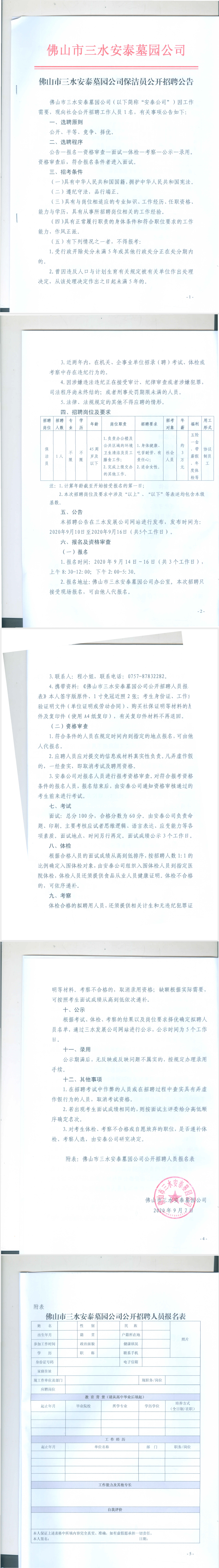 佛山市三水安泰墓园公司保洁员公开招聘公告