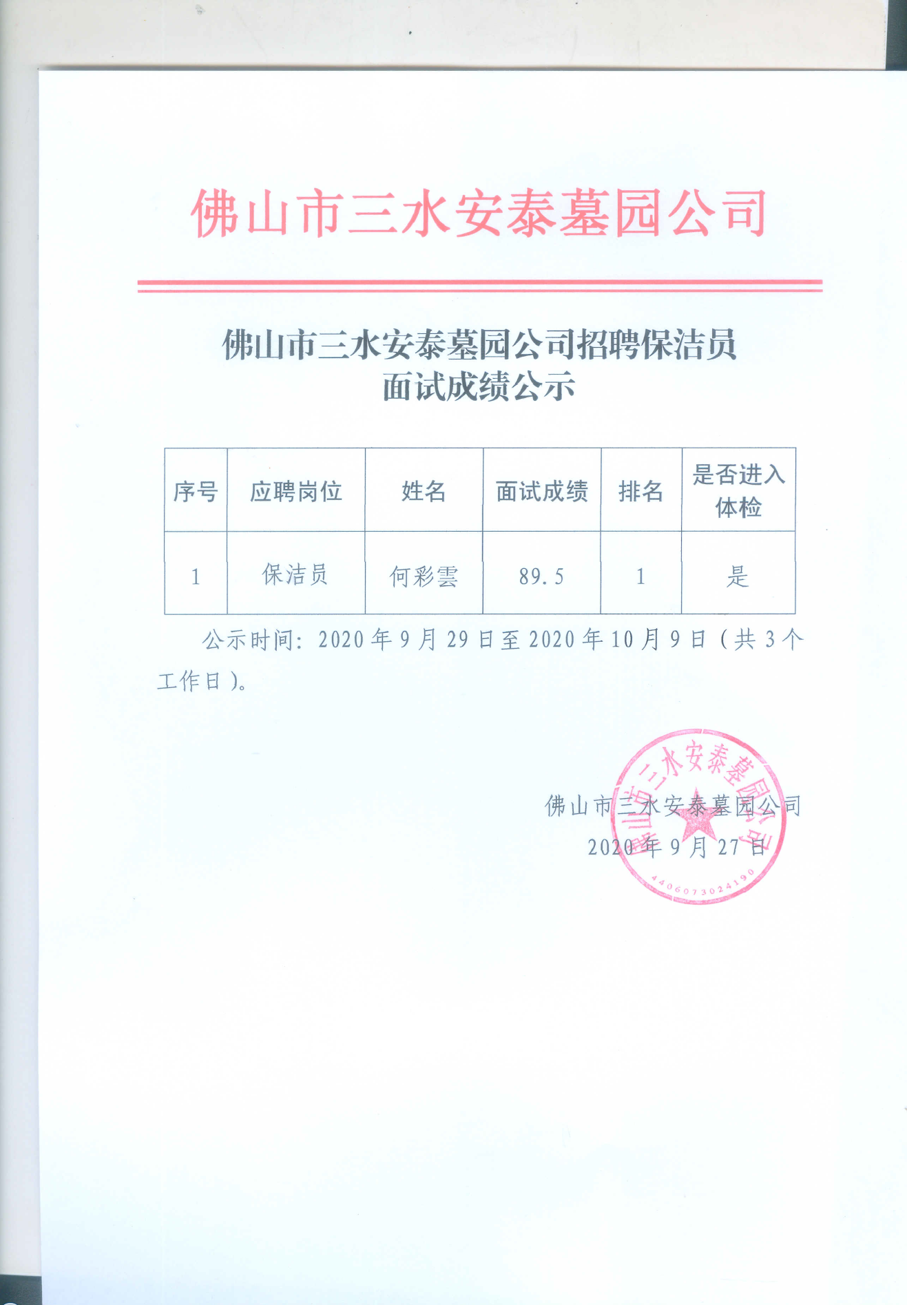 佛山市三水安泰墓园公司招聘保洁员面试成绩公示