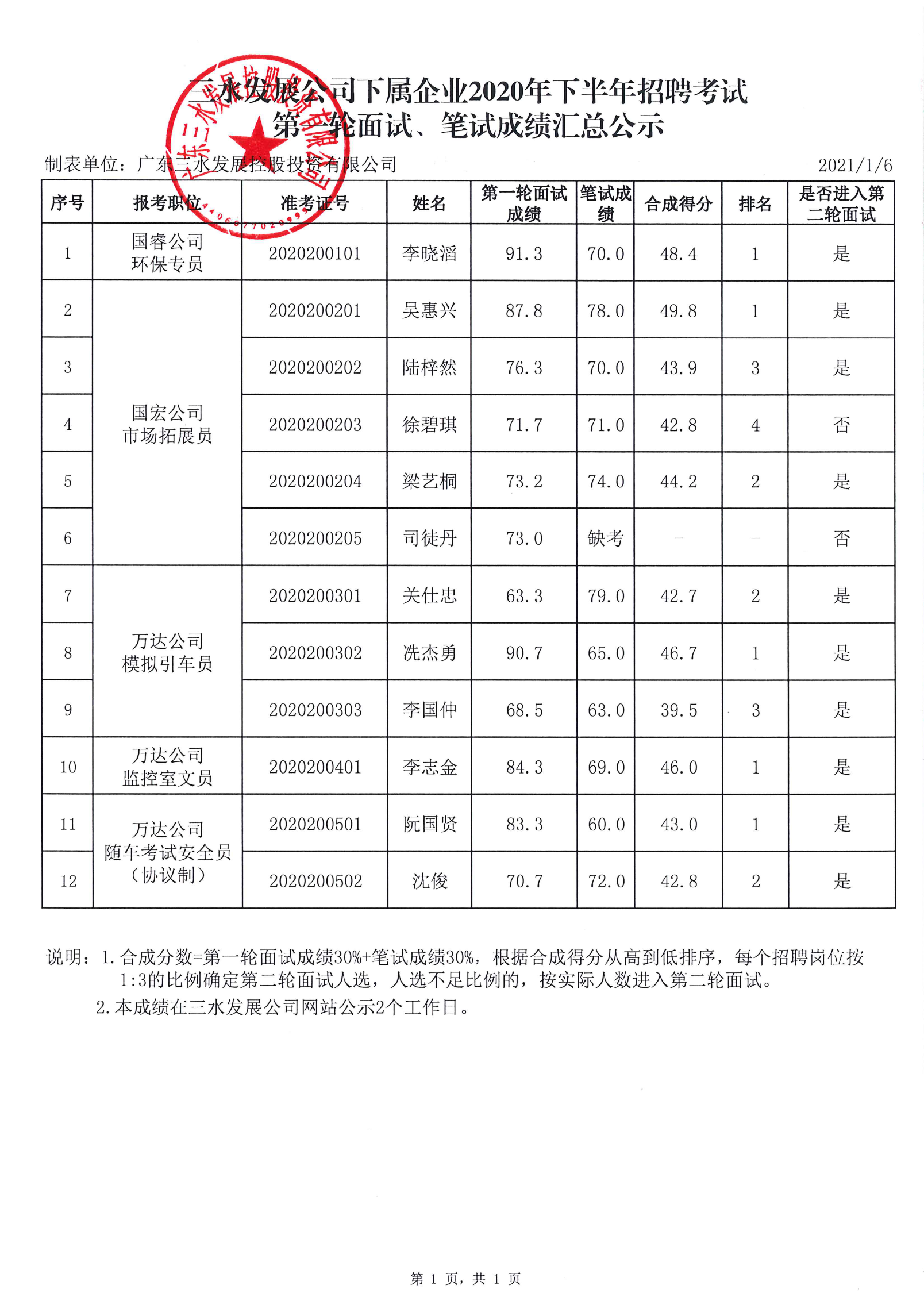 bv1946伟德官网公司下属企业2020年下半年招聘考试第一轮面试、笔试成绩汇总公示