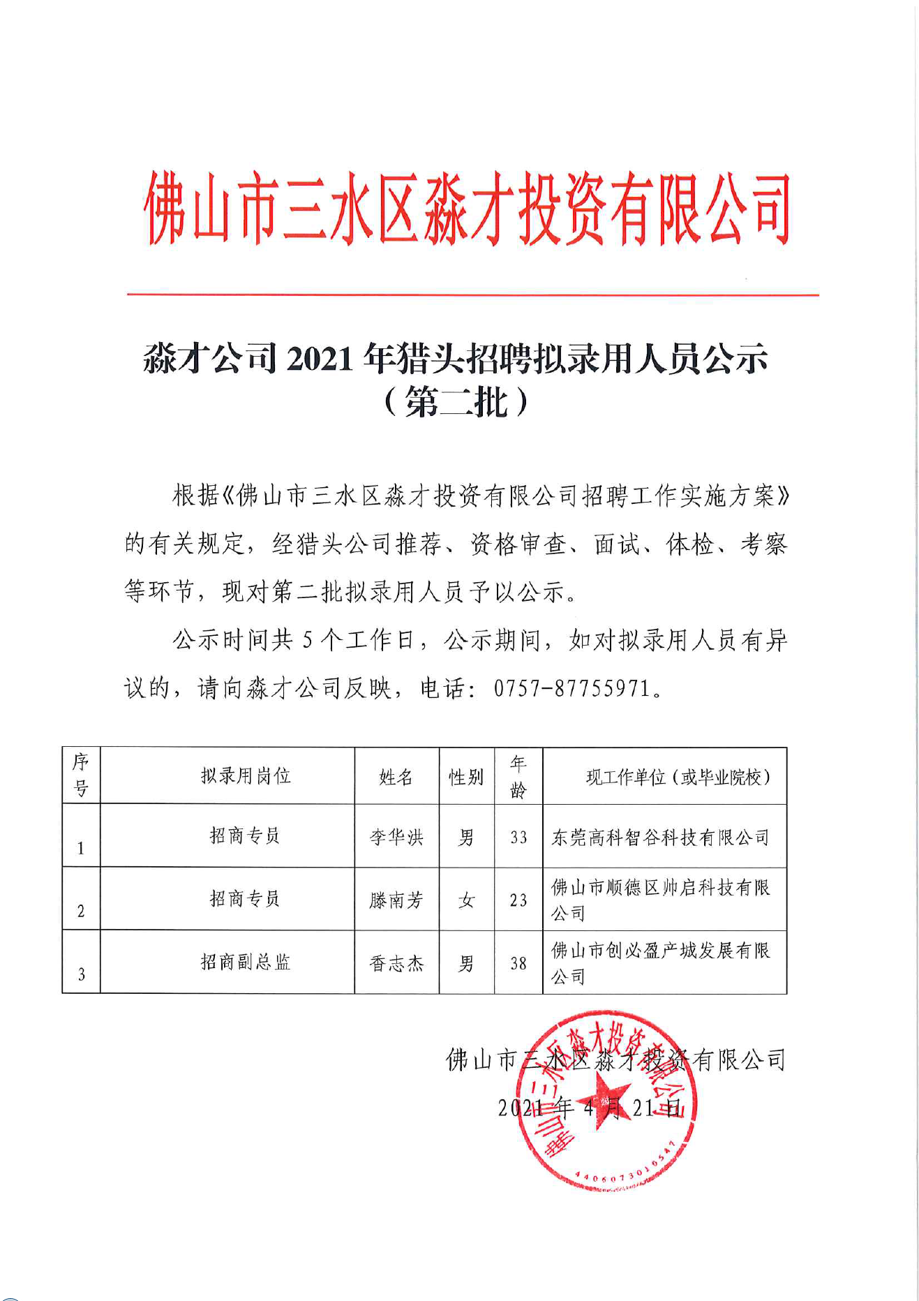 淼才公司2021年猎头招聘招商人员拟录用人员公示(第二批)