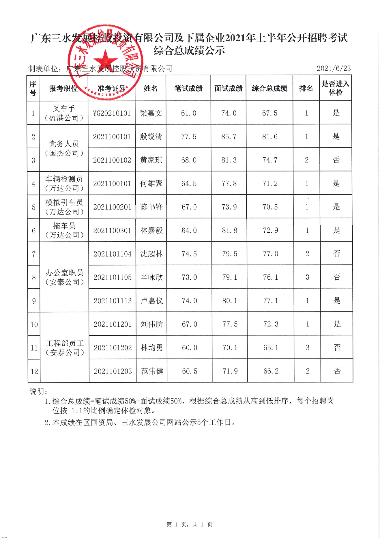 1946伟德官方网站及下属企业2021年上半年公开招聘考试综合总成绩公示