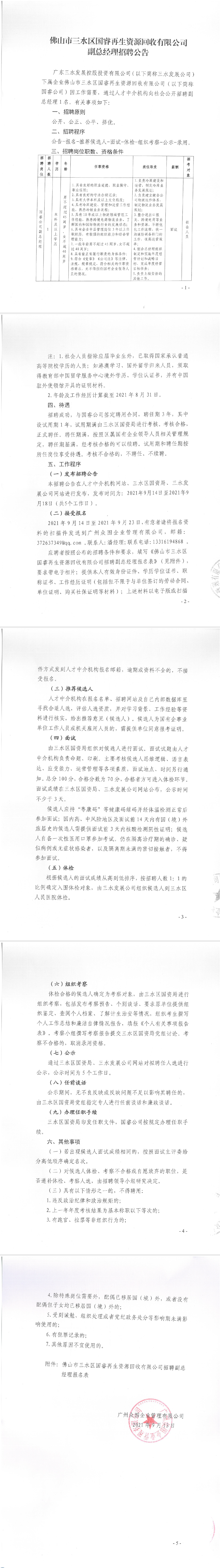 佛山市三水区国睿再生资源回收有限公司副总经理招聘公告