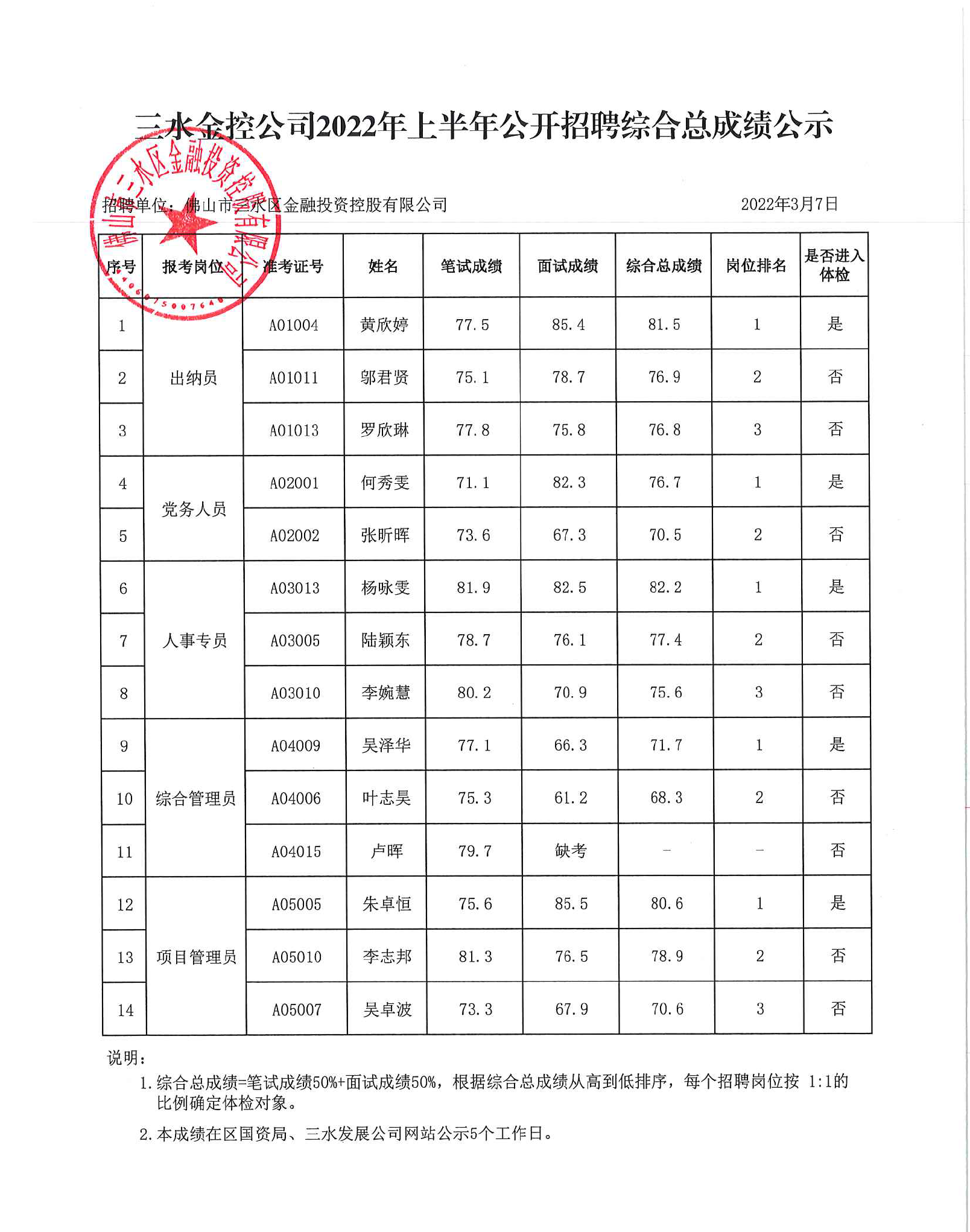 三水金控公司2022年上半年公开招聘综合总成绩公示