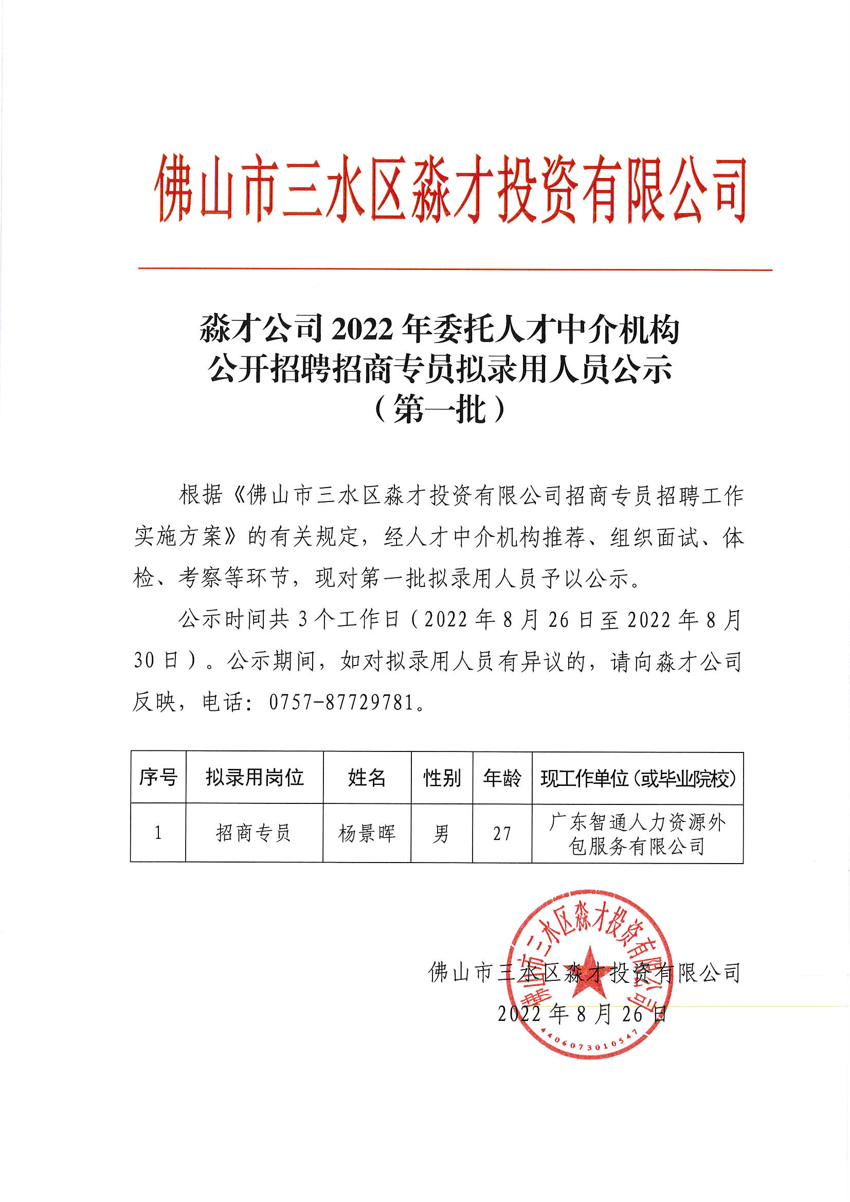 淼才公司2022年委托人才中介机构公开招聘招商专员拟录用人员公示(第一批)