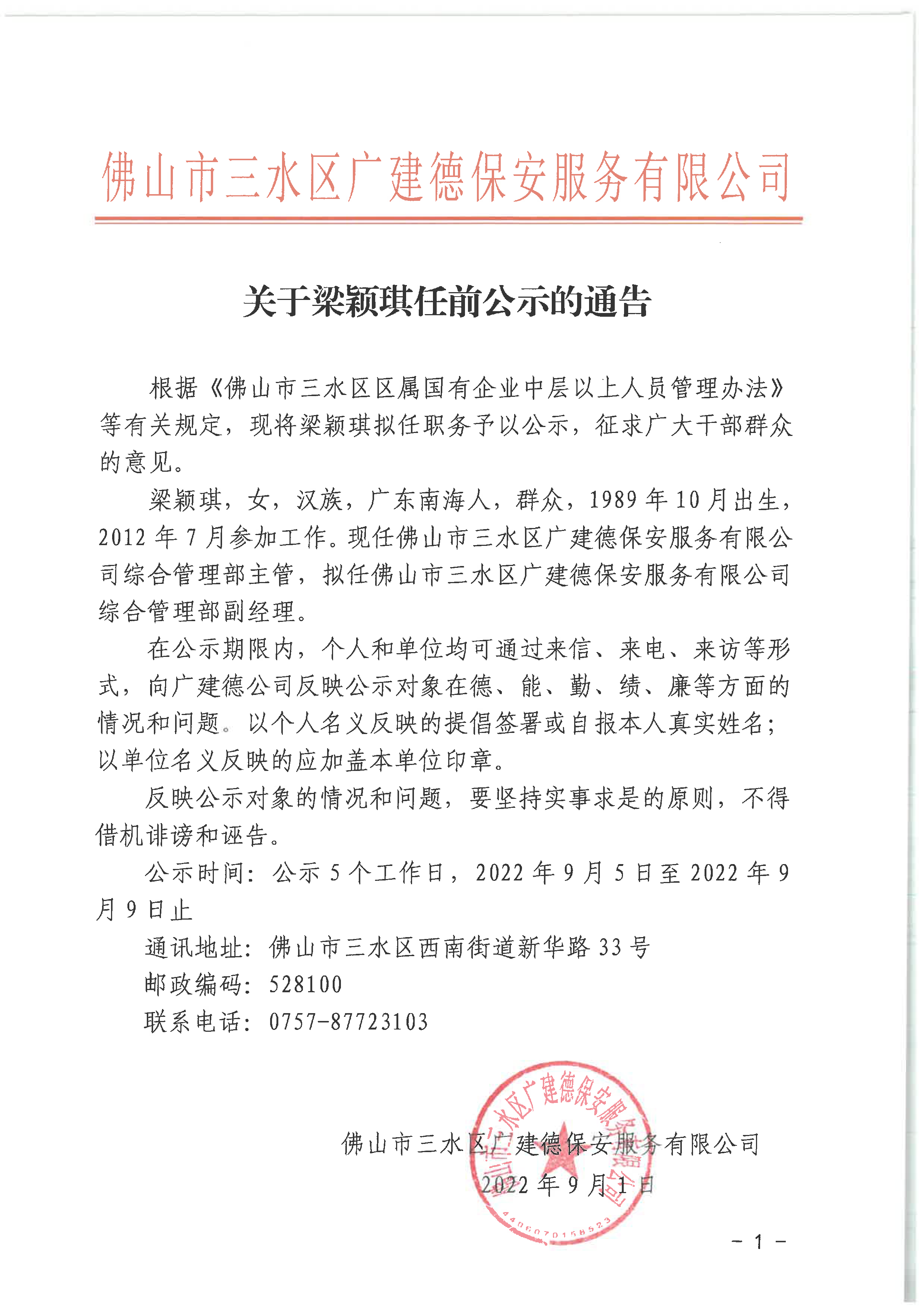 关于梁颖琪任前公示的通告