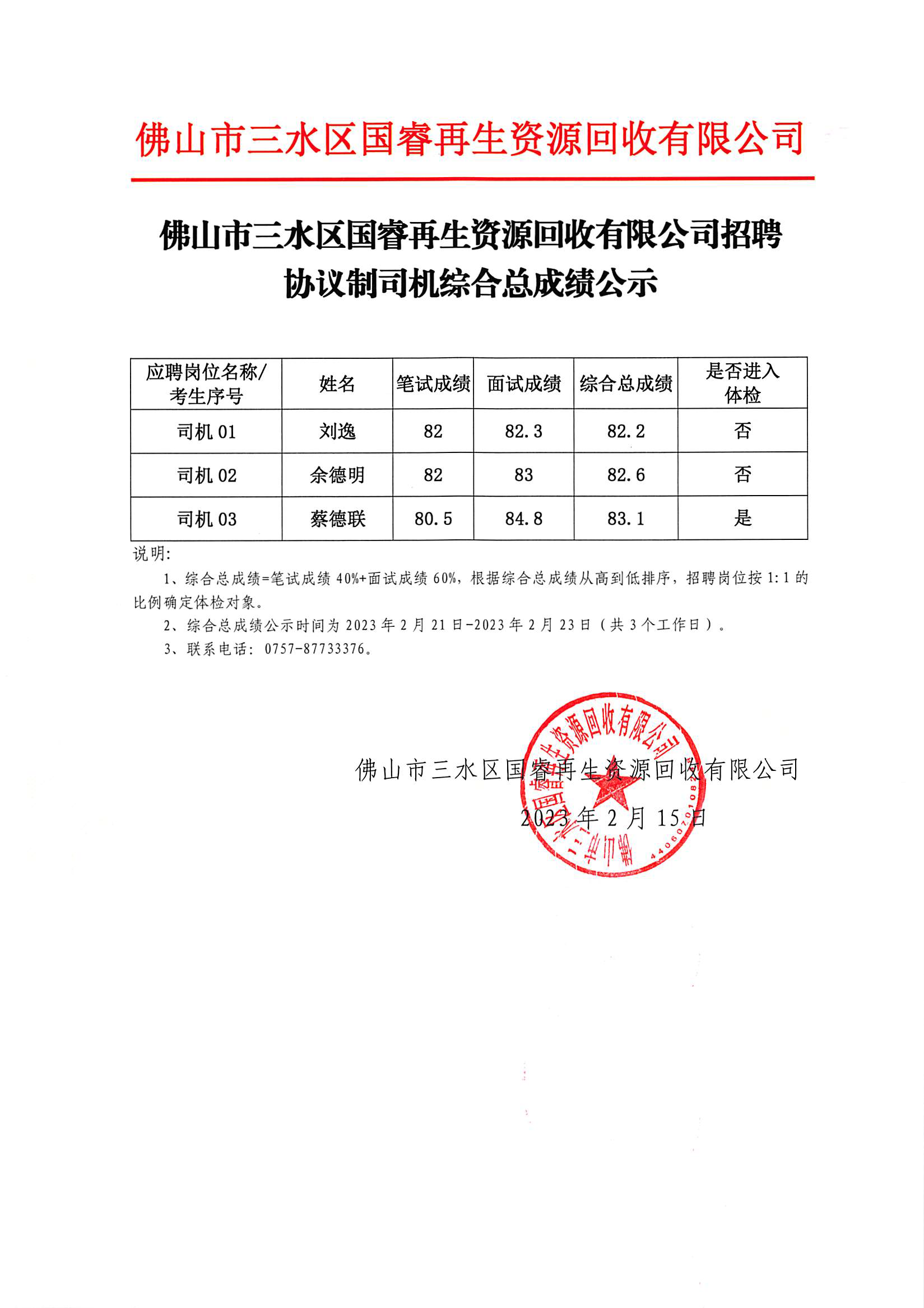 佛山市三水区国睿再生资源回收有限公司招聘协议制司机综合总成绩公示