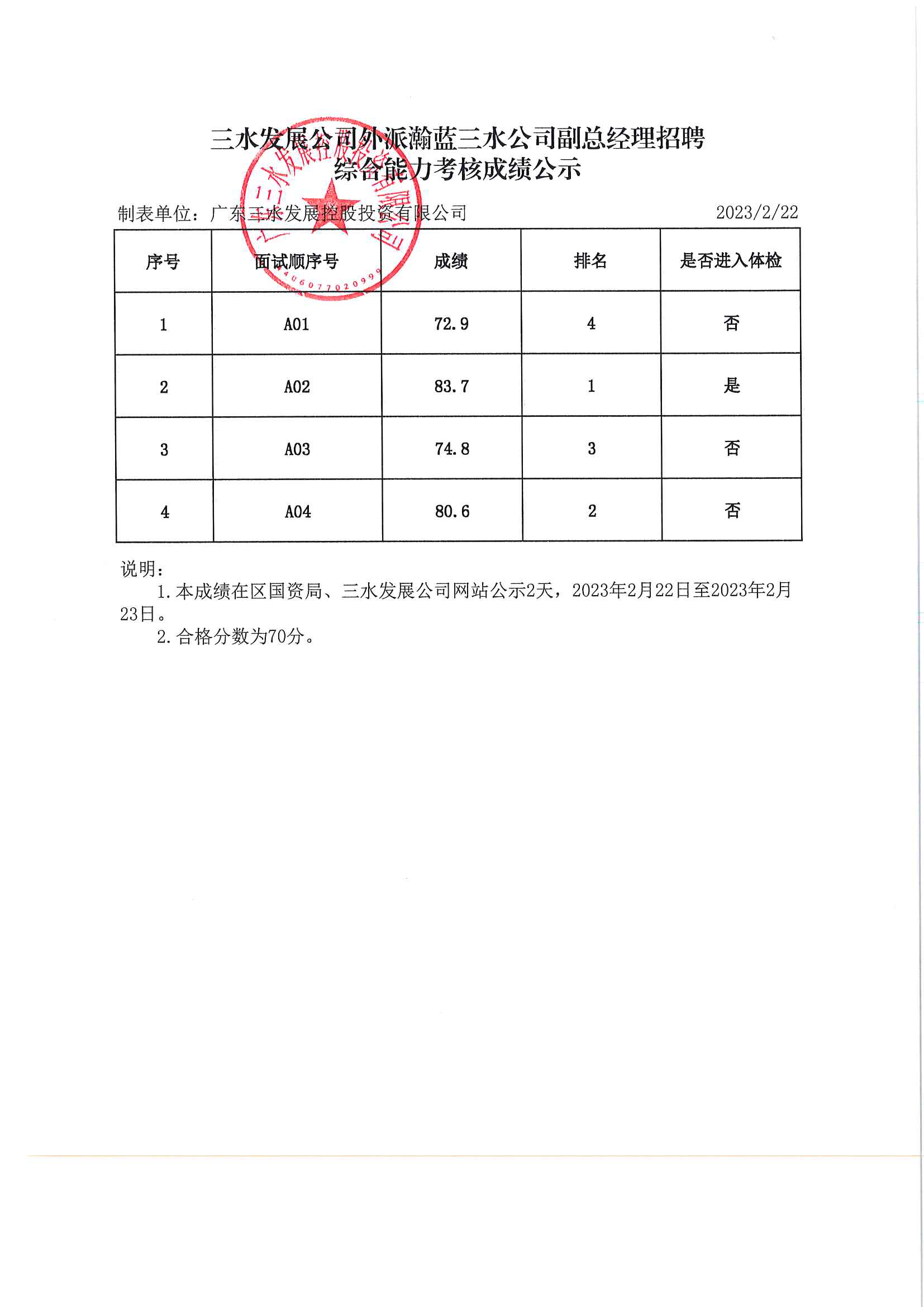 bv1946伟德官网公司外派瀚蓝三水公司副总经理招聘综合能力考核成绩公示
