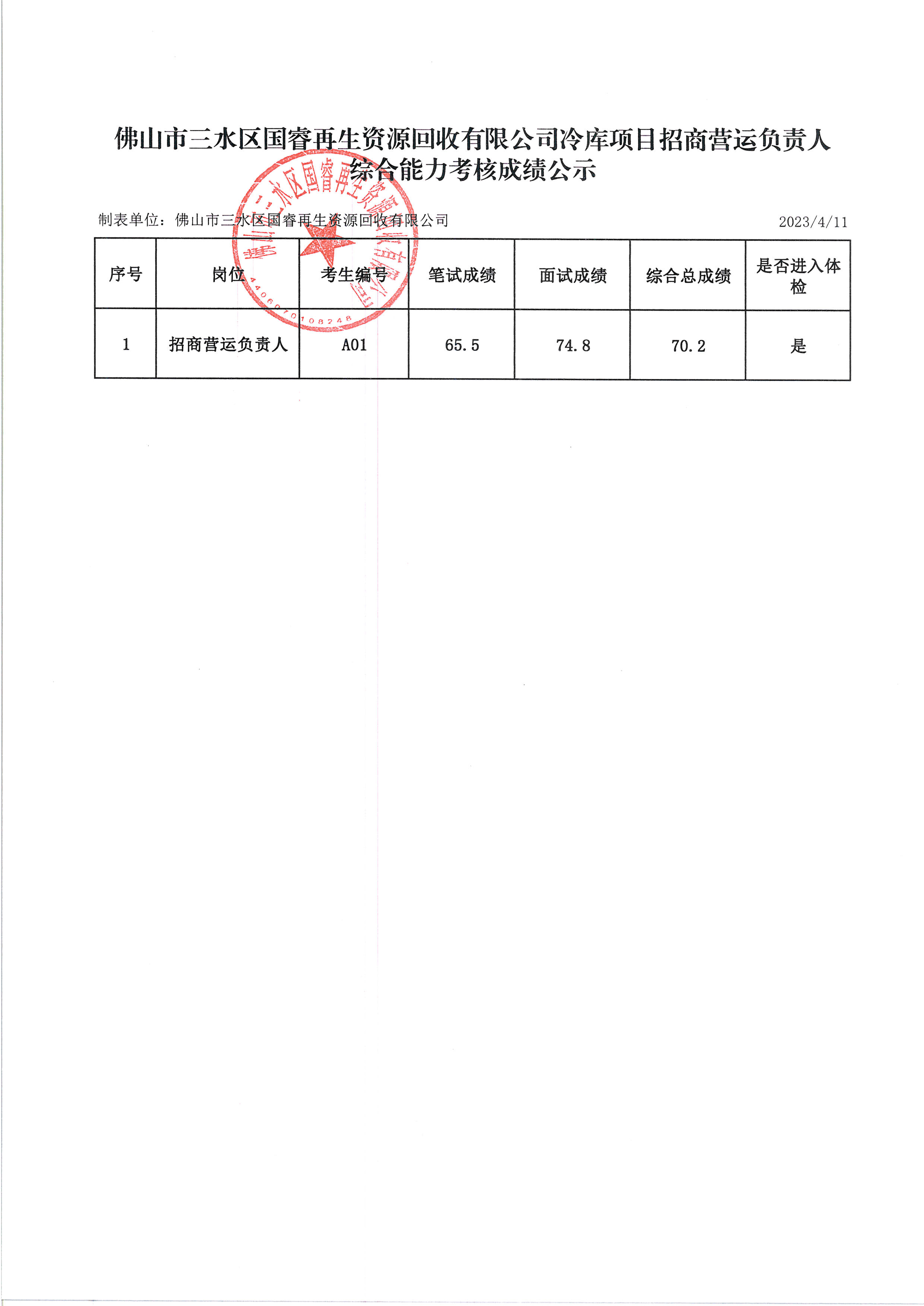 佛山市三水区国睿再生资源回收有限公司冷库项目招商营运负责人综合能力考核成绩公示