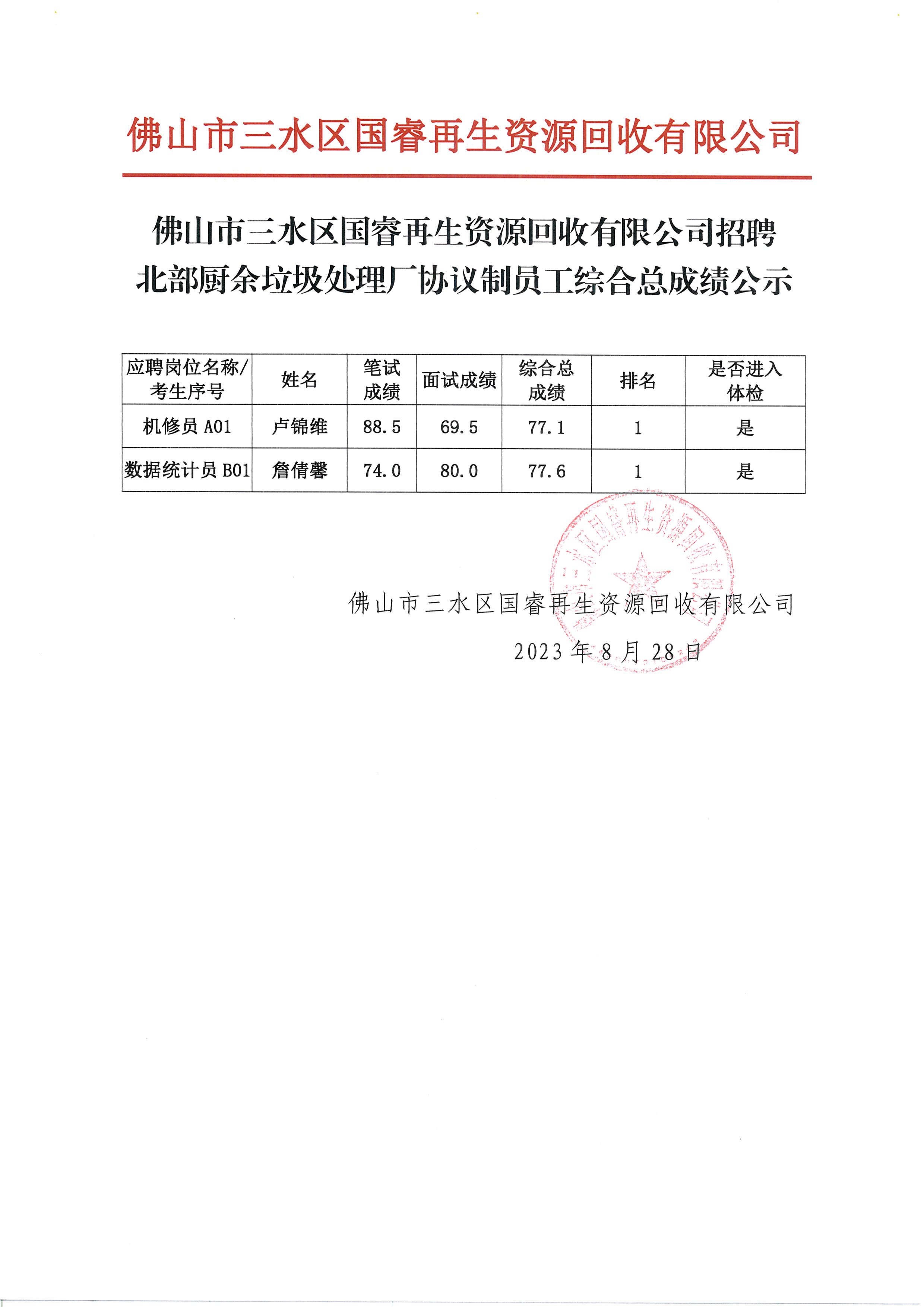 佛山市三水区国睿再生资源回收有限公司招聘北部厨余垃圾处理厂协议制员工综合总成绩公示