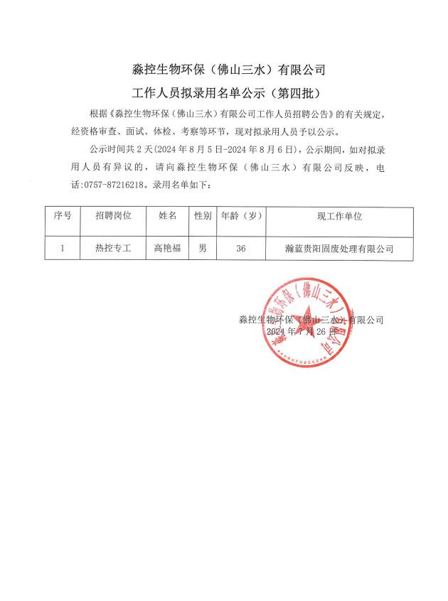 淼控生物环保(佛山三水)有限公司工作人员拟录用名单公示(第四批)