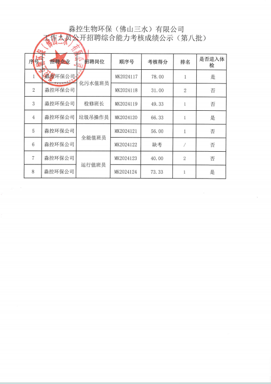 淼控生物环保(佛山三水)有限公司工作人员公开招聘综合能力考核成绩公示(第八批)