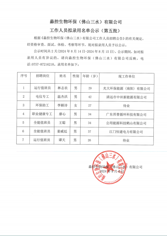 淼控生物环保(佛山三水)有限公司工作人员拟录用名单公示(第五批)