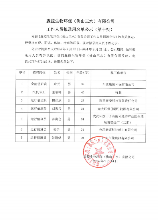 淼控生物环保(佛山三水)有限公司工作人员拟录用名单公示(第十批)