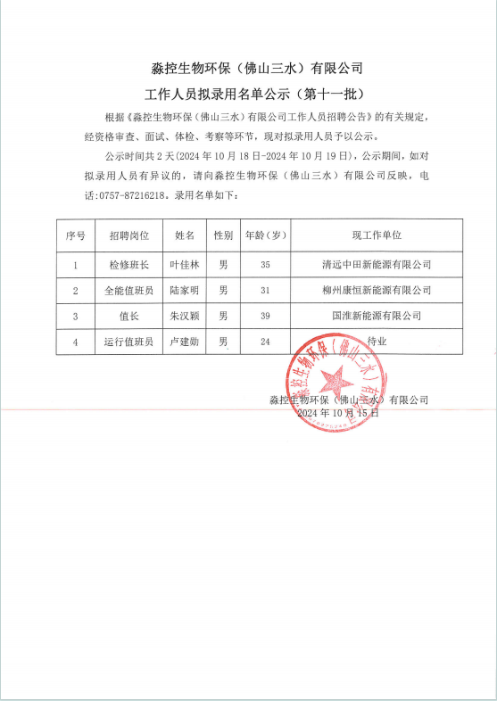 淼控生物环保(佛山三水)有限公司工作人员拟录用名单公示(第十一批)