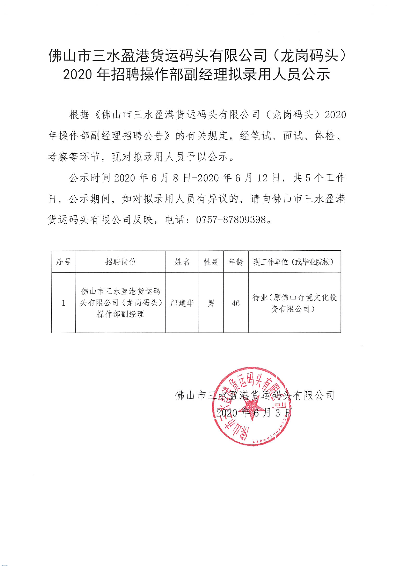 佛山市三水盈港货运码头有限公司(龙岗码头)招聘操作部副经理拟录用人员公示