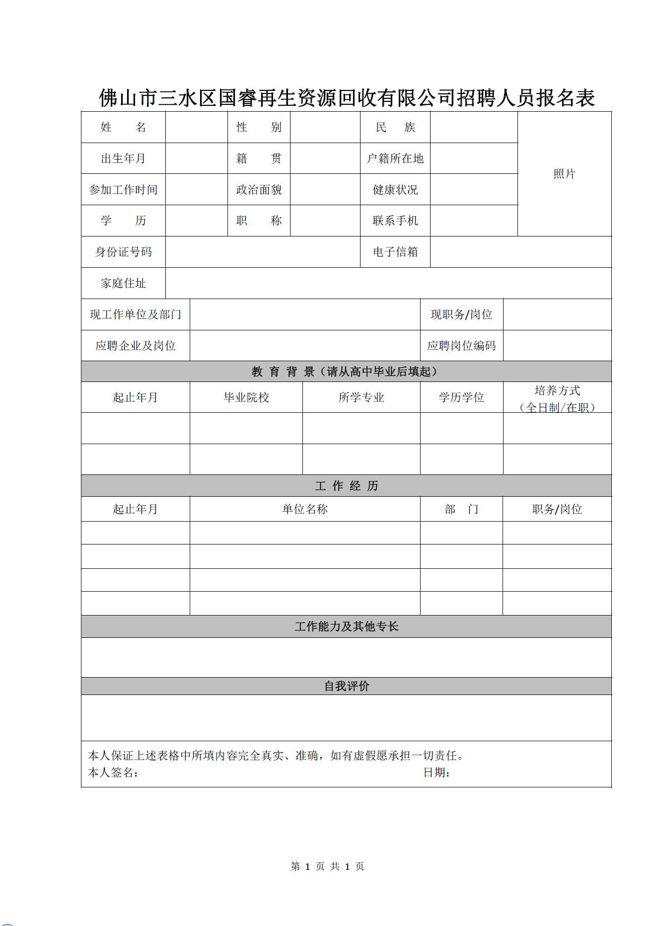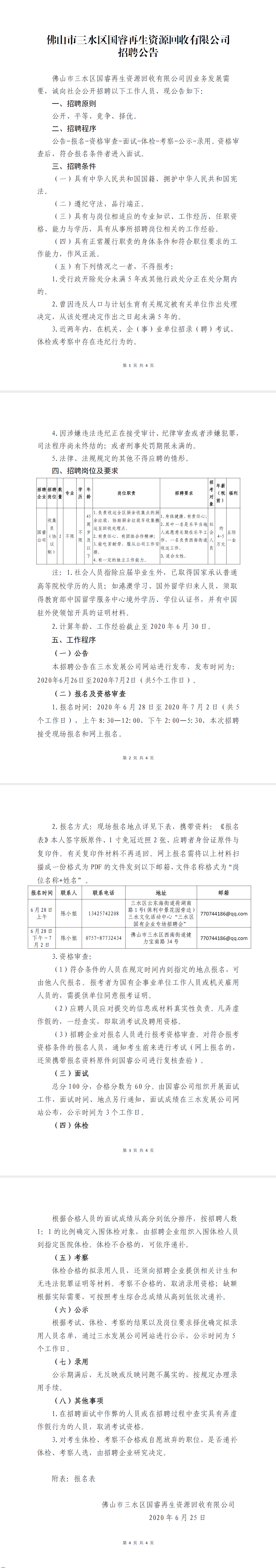 佛山市三水区国睿再生资源回收有限公司招聘公告