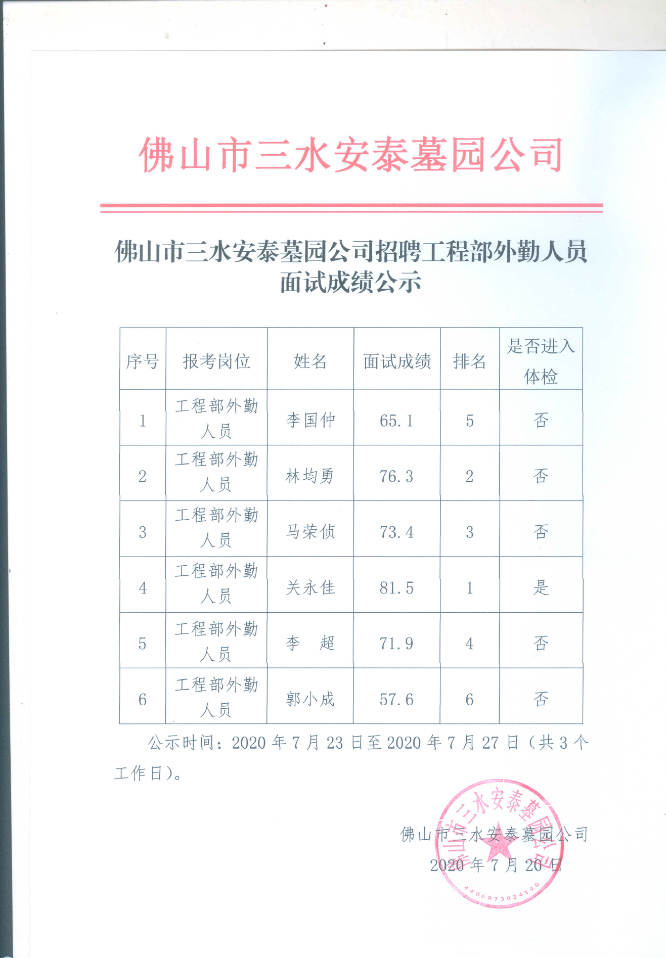 佛山市三水安泰墓园公司招聘工程部外勤人员面试成绩公示