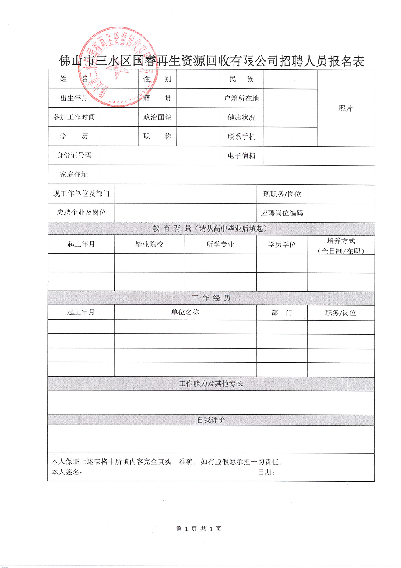 佛山市三水区国睿再生资源回收有限公司招聘公告
